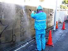 この依頼作業は、工場跡地に残された塀のイタズラ書きスプレーペンキの除去作業になります。塀の素材がブロック塀でしたので、高圧洗浄機圧力と塗料剥離剤を使用し表面の汚れと共に、除去した作業になります。