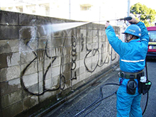 この依頼作業は、工場跡地に残された塀のイタズラ書きスプレーペンキの除去作業になります。塀の素材がブロック塀でしたので、高圧洗浄機圧力と塗料剥離剤を使用し表面の汚れと共に、除去した作業になります。